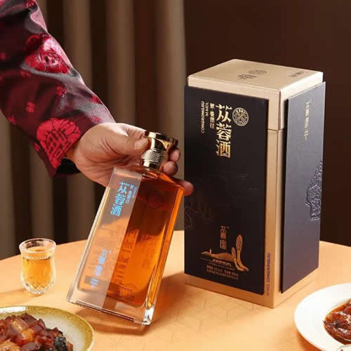 蓯蓉酒是一款53°濃香型白酒,選用清香型白酒作為基酒,選用藥食同源阿拉善荒漠肉蓯蓉作為主原料,配以枸杞子、覆盆子等多種名貴中藥材配置而成。