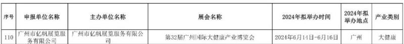 這周,廣東省商務(wù)廳發(fā)布了《關(guān)于印發(fā)2024年“粵貿(mào)全國(guó)”活動(dòng)目錄的通知》。《通知》公布了2024年“粵貿(mào)全國(guó)”境內(nèi)展會(huì)活動(dòng)目錄,其中由廣州市億帆展覽服務(wù)有限公司主辦的第32屆廣州國(guó)際大健康產(chǎn)業(yè)博覽會(huì)入選此目錄。