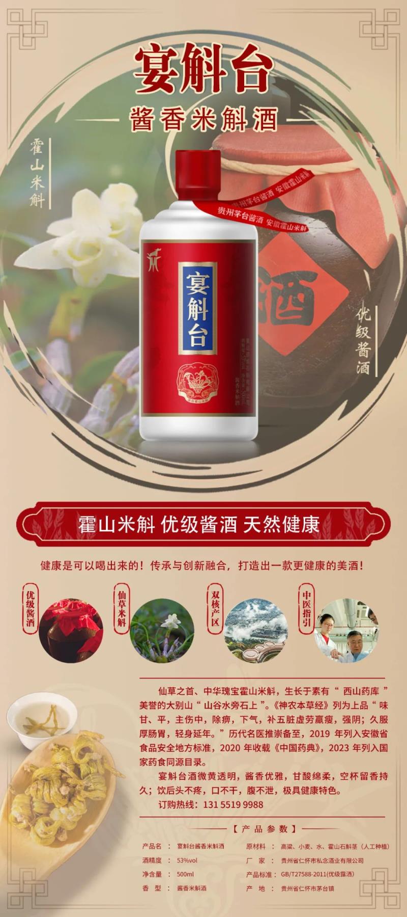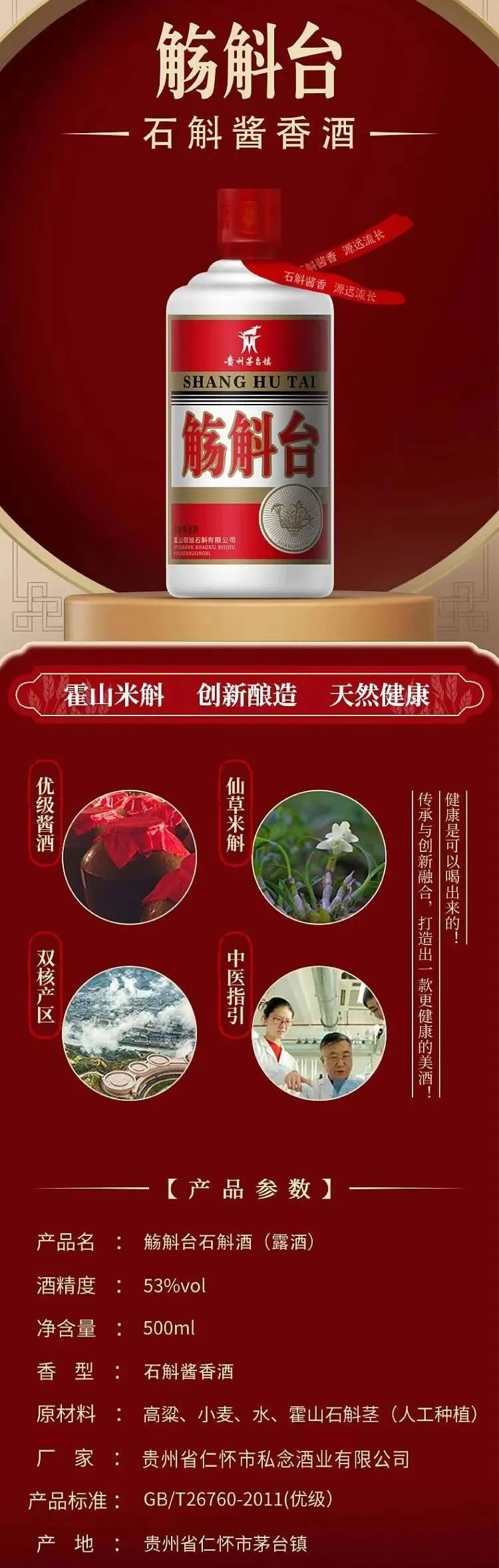 宴斛臺酒,精選霍山特級鐵皮石斛配以茅臺鎮(zhèn)核心產(chǎn)區(qū)優(yōu)級醬香酒,經(jīng)陰陽調(diào)和特殊工藝釀制而成,具有微黃色透明、斛香醬香融合協(xié)調(diào)、優(yōu)雅細(xì)膩、回甘悠長的醇厚酒體,具有其香雅雅,其味綿綿,空杯留香持久、醒酒快顯著特點。