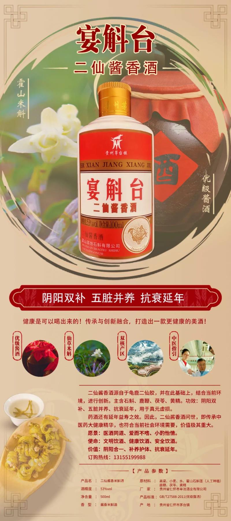 二仙醬酒,精選霍山特級鐵皮石斛、黃精、茯苓、鹿鞭配以茅臺鎮(zhèn)核心產(chǎn)區(qū)優(yōu)級醬香酒,經(jīng)陰陽調(diào)和特殊工藝釀制而成,具有微黃色透明、斛香醬香融合協(xié)調(diào)、優(yōu)雅細(xì)膩、回甘悠長的醇厚酒體,具有其香雅雅,其味綿綿,空杯留香持久、醒酒快顯著特點。