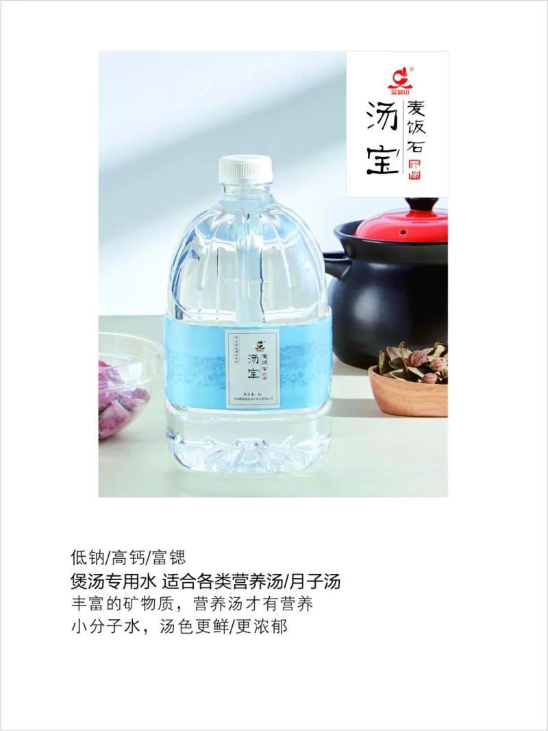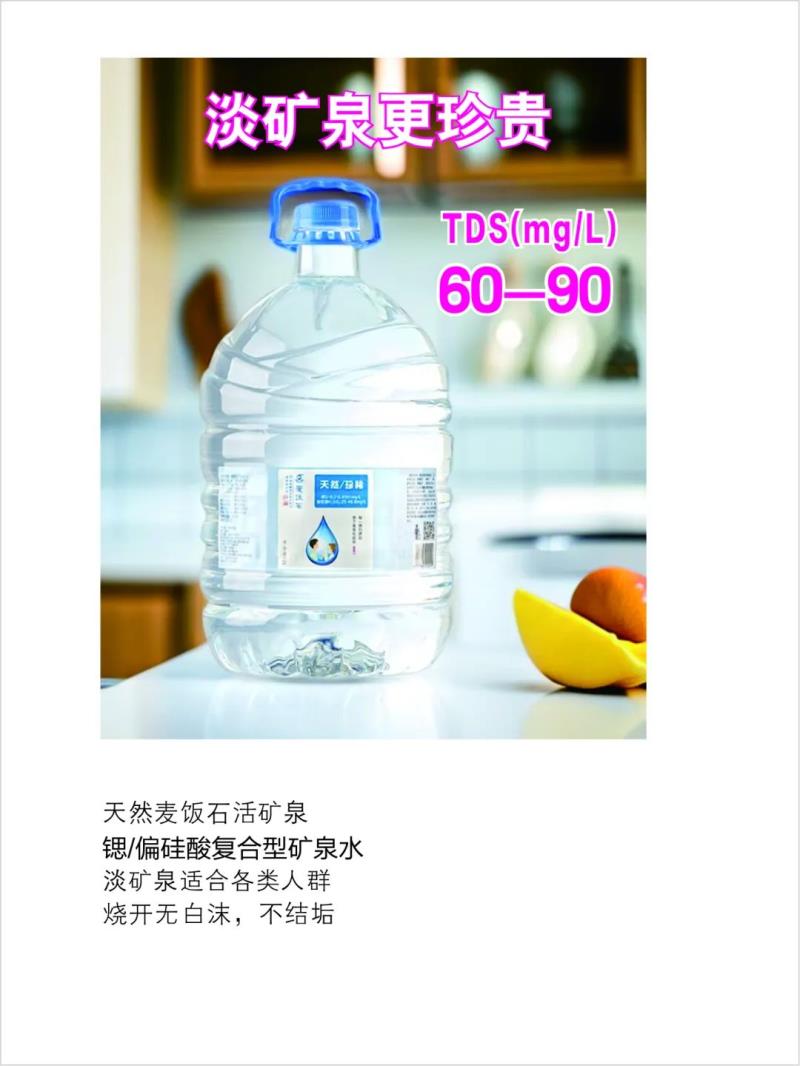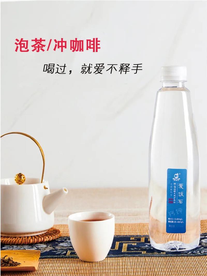 520ML/360ML/5L/12L為重碳酸鈣型鍶/偏硅酸型礦泉水,鈉含量為1.5-3.8MG/L,溶解性總固體(TDS)60-100MG/L,PH值為7.0-7.22。為低鈉、淡礦、弱堿性淡礦泉,適合各年齡段人群飲用。4L為天然麥飯石泉水,取自地下80多米麥飯石巖層,水質清冽甘甜,適合泡各類茶。