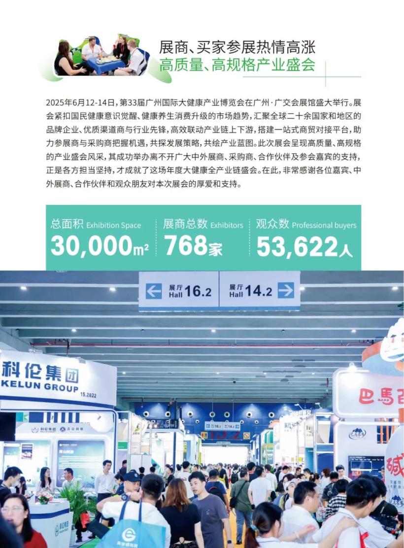 2025年6月12-14日,第33屆廣州國(guó)際大健康產(chǎn)業(yè)博覽會(huì)在廣州·廣交會(huì)展館盛大舉行。展會(huì)緊扣國(guó)民健康意識(shí)覺(jué)醒、健康養(yǎng)生消費(fèi)升級(jí)的市場(chǎng)趨勢(shì),匯聚全球二十余國(guó)家和地區(qū)的品牌企業(yè)、優(yōu)質(zhì)渠道商與行業(yè)先鋒,高效聯(lián)動(dòng)產(chǎn)業(yè)鏈上下游,搭建一站式商貿(mào)對(duì)接平臺(tái),助力參展商與采購(gòu)商把握機(jī)遇,共探發(fā)展策略,共繪產(chǎn)業(yè)藍(lán)圖。