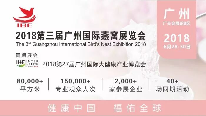 2018第三屆廣州國(guó)際燕窩展覽會(huì)(簡(jiǎn)稱:燕窩展IBE)將定于2018年6月28日-30日在廣州·廣交會(huì)展館舉辦,并與第27屆廣州國(guó)際大健康博覽會(huì)同期召開。燕窩展由燕窩產(chǎn)業(yè)國(guó)際聯(lián)盟、中國(guó)藥文化研究會(huì)燕窩分會(huì)與知名展覽主辦方英富曼意帆聯(lián)手打造,旨在推動(dòng)燕窩產(chǎn)業(yè)健康高速發(fā)展。燕窩展匯聚印度尼西亞、馬來西亞、新加坡、泰國(guó)、越南、香港、澳門、海南等原產(chǎn)地最優(yōu)秀的燕窩企業(yè),專業(yè)性強(qiáng)、規(guī)模宏大,共商共贏。廣東作為燕窩產(chǎn)品的消費(fèi)大省及重要集散地,國(guó)際燕窩展覽會(huì)在廣州召開, 勢(shì)必得天獨(dú)厚。