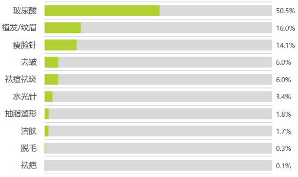 醫(yī)美服務(wù)市場(chǎng)接受程度快速提高。玻尿酸、植發(fā)/紋眉、瘦臉類塑形服務(wù)合計(jì)占據(jù)8成市場(chǎng)份額。其中玻尿酸成為當(dāng)之無愧的美容塑形爆款產(chǎn)品,單品年度成交額占比已超過50%,成交額占比在10%以上的美容塑形產(chǎn)品服務(wù),除玻尿酸外則有植發(fā)/紋眉及瘦臉針, 三者銷售份額合計(jì)超過80%。