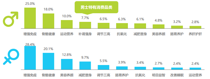 男士運(yùn)動(dòng)強(qiáng)身訴求集中,女士保健訴求多樣化:增強(qiáng)免疫與骨骼健康是群體消費(fèi)共性,“補(bǔ)腎強(qiáng)身”,“養(yǎng)肝護(hù)肝”則是男性特有的消費(fèi)品類,成交額分別占比7.7%與2.8%,“美容養(yǎng)顏”與“減肥塑身”兩類產(chǎn)品在女性保健品類中消費(fèi)占據(jù)前五。