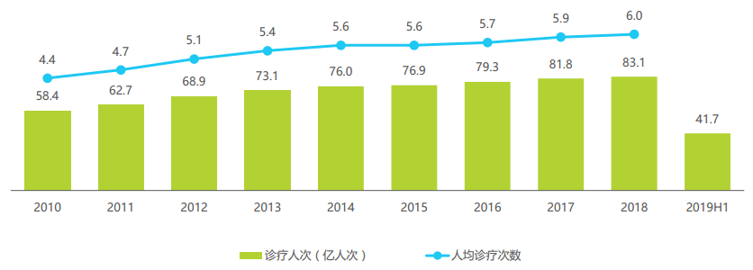 2010-2019H1中國年診療人次及人均診療次數(shù)