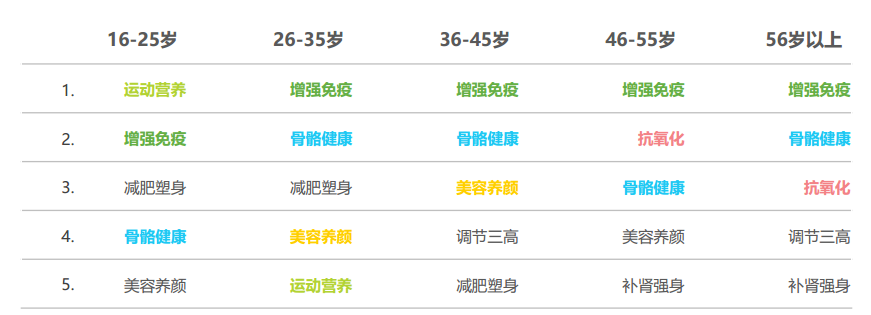 2019年中國各年齡段用戶保健品消費(fèi)TOP5類型