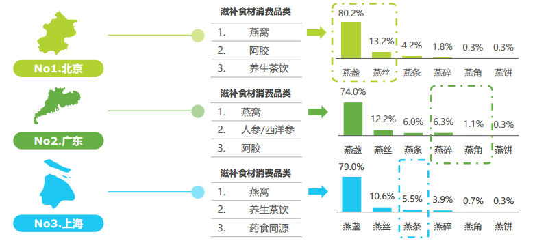 ★燕窩消費(fèi)北京大氣闊綽,上海精致理性,廣東低調(diào)內(nèi)斂:北京地區(qū)燕窩消費(fèi)以價(jià)格較高燕盞燕絲為主,合計(jì)占比超過93%;上海消費(fèi)者精致理性,有5.5%的燕窩消費(fèi)選擇在有較高性價(jià)比的燕條;廣東人民最為低調(diào),高單價(jià)的燕盞燕絲消費(fèi)為三地最低。