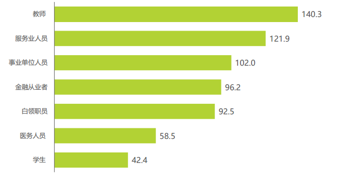 這類消費(fèi)者的年齡段主要集中在26-45歲,其中66.1%處于已婚狀態(tài),90.3%的用戶購買力歸屬為中等或高收入人群。其中教師、服務(wù)人員對(duì)緩解疲勞類保健品的消費(fèi)需求更高。教師、服務(wù)業(yè)人員、事業(yè)單位人員成為核心焦慮群體,其在緩解疲勞類保健品目標(biāo)人群指數(shù)分別高達(dá)140.3、121.9及102.0,在整體人群當(dāng)中表現(xiàn)突出,而經(jīng)濟(jì)能力尚未成熟的學(xué)生則TGI指數(shù)表現(xiàn)略低。