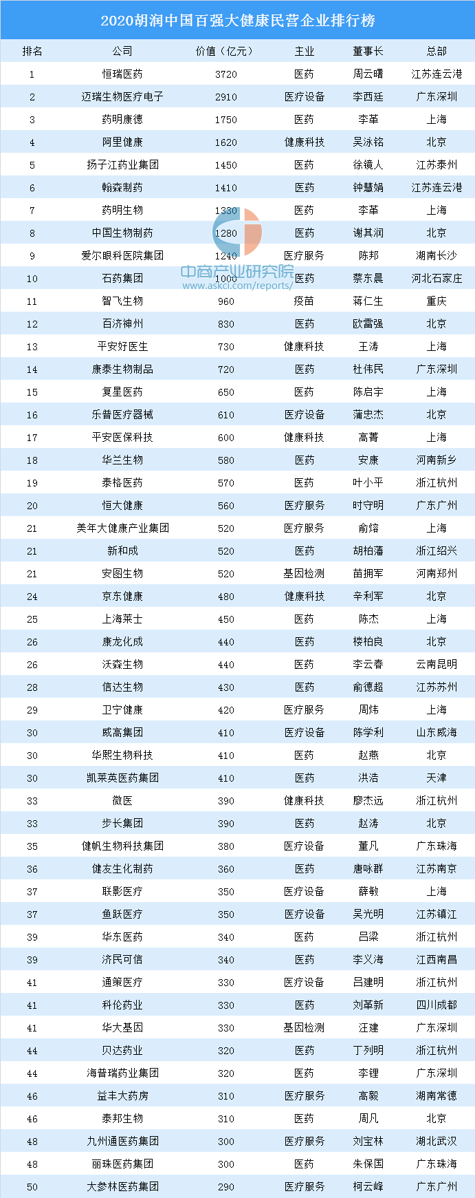 3月18日,胡潤研究院發(fā)布《2020胡潤中國百強(qiáng)大健康民營企業(yè)》 ,榜單顯示,上榜門檻為150億元,上榜企業(yè)總市值4.7萬億元。恒瑞醫(yī)藥市值3720億成為中國大健康領(lǐng)域價(jià)值最高的企業(yè)。邁瑞醫(yī)療以2910億市值位列第二。藥明康德以1750億市值排名第三。此外,阿里健康、揚(yáng)子江藥業(yè)集團(tuán)、翰森制藥、藥明生物、中國生物制藥、愛爾眼科醫(yī)院集團(tuán)、石藥集團(tuán)進(jìn)入榜單前十。