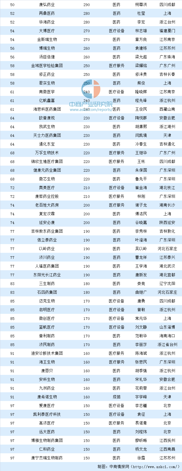 從上榜企業(yè)行業(yè)分布來看,醫(yī)藥是上榜企業(yè)最多的行業(yè),有62家;其次是醫(yī)療設(shè)備和醫(yī)療服務(wù),各有17家和15家。前三大行業(yè)上榜企業(yè)占總榜九成。