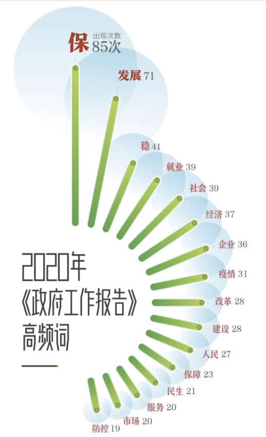 “穩(wěn)就業(yè)、保民生”貫穿整份報(bào)告。在2020年《政府工作報(bào)告》中,“?!笔浅霈F(xiàn)頻次最高的詞,共出現(xiàn)85次。