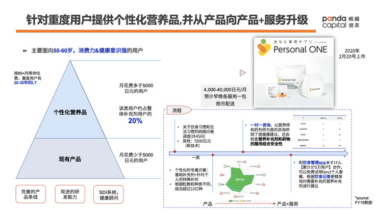 這個方向上的持續(xù)思考和積累最終使Fancl在2020年2月推出其個性化營養(yǎng)品服務(wù)Personal One。用戶在填寫網(wǎng)絡(luò)問卷和進行尿檢后,會得到個性化專屬方案,每月定價在4,000-40,000日元不等。Personal One的服務(wù)中還包含一對一咨詢,以營養(yǎng)師和藥劑師為首的咨詢師除了提供健康建議,還會檢查營養(yǎng)補充劑和藥物的服用組合的安全性(基于Fancl自研的SDI系統(tǒng))。同時,F(xiàn)ancl還嘗試和有400多萬用戶的日本飲食管理APP (https://www.asken.jp) 合作,購買了個性化產(chǎn)品的用戶可以在該 app上免費使用Fancl個人套餐,從而Fancl能夠根據(jù)飲食記錄更精準地為用戶提供營養(yǎng)補充劑建議。