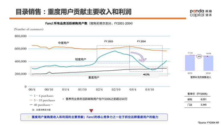 1995-2002財年期間,F(xiàn)ancl郵購銷售占比超6成,是絕對的主力銷售渠道。2000財年后,由于整體市場競爭加劇,價格廝殺激烈,F(xiàn)ancl的相對優(yōu)勢不明顯,郵購渠道獲取新客上呈現(xiàn)頹勢,獲客成本開始明顯增加。到2004財年,郵購用戶的下降趨勢已經(jīng)非常明顯,尤其是輕度和中度用戶數(shù)持續(xù)走低;不過從銷售額看,營養(yǎng)補充劑業(yè)務(wù)郵購銷售僅降低4%,主要原因是重度用戶此時仍然保持了持續(xù)增長(+6.3%)。