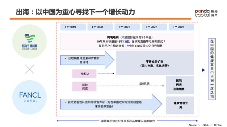 2016年至今:如前面所述,《功能性食品標示制度》出臺之后,對Fancl這樣的企業(yè)是非常大的利好。Fancl 抓住了政策紅利的機會,推出多款明星產(chǎn)品,實現(xiàn)銷售V字形反轉(zhuǎn)。截止到3月31日的2019財年,F(xiàn)ancl的營養(yǎng)補充劑銷售額達到439億日元(約合28億人民幣),毛利率接近70%。由于日本本土市場相對受限,F(xiàn)ancl也開始重點探求海外尤其中國的發(fā)展機會,尋求更大的發(fā)展空間。