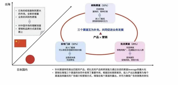 把Fancl渠道整體分為日本本土市場和海外市場來看。在本土市場上,傳統(tǒng)的優(yōu)勢郵購渠道、反復(fù)摸索的自營線下門店以及逐步增長的批發(fā)渠道目前在份額上呈現(xiàn)三足鼎立的態(tài)勢,三大渠道相互協(xié)同,互為補充。Fancl針對渠道的不同特性推出與之相匹配的產(chǎn)品,把扎實的產(chǎn)品和研發(fā)能力借助合適的渠道實現(xiàn)銷售額的最大化。