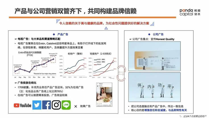 為什么Fancl要重視公司的形象廣告并做巨幅投入,這一點也值得關(guān)注。一方面是在2015年新法案出臺之前,監(jiān)管層不允許做功能性產(chǎn)品的相關(guān)廣告,F(xiàn)ancl選擇了做公司的形象廣告,主力宣傳公司的研發(fā)能力以及品牌的安全可信賴,著力宣傳Fancl“令人信賴的關(guān)于美與健康的品牌,為社會性問題提供好的解決方案”這一公司品牌。而在監(jiān)管層允許功能性產(chǎn)品投放廣告后,公司形象廣告和產(chǎn)品廣告雙管齊下的好處是:一方面,了解Fancl的消費者可以選擇Fancl的各種明星單品;另一方面,即使消費者不那么了解Fancl的系列產(chǎn)品,但在自己有營養(yǎng)補充劑需求的情況下,也能第一時間想到Fancl品牌。