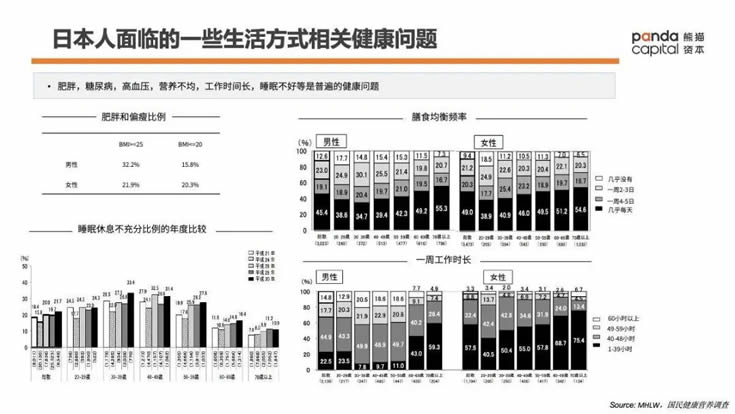 我們看到,中國市場上,無論是老年人在預(yù)防疾病的剛性健康需求,還是90后年輕人的“用最貴的產(chǎn)品,熬最長的夜”的“朋克養(yǎng)生”需求,因為人口結(jié)構(gòu)的變化,生活方式不健康導(dǎo)致各類疾病也日益成為社會型問題。加之,中國的健康保險系統(tǒng)不像日本那么發(fā)達,人們自發(fā)的預(yù)防保健意識更為強烈。