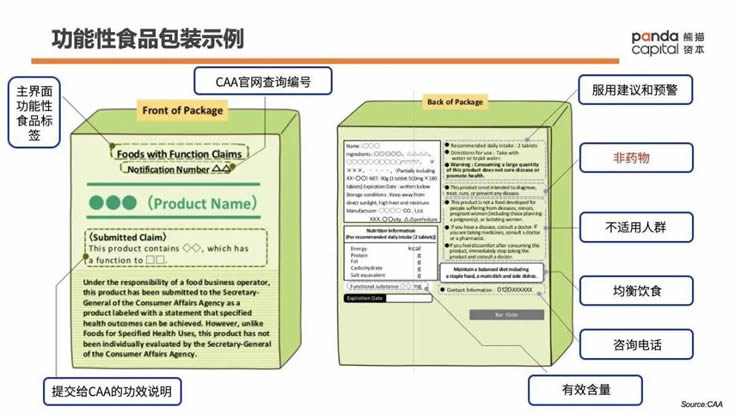 2015年新規(guī)出臺,全名為《功能性食品標示制度》。新規(guī)的很大不同在于政府不再實際評估功能性食品的安全和有效性,企業(yè)只需于上市銷售60日前向日本消費者廳提交與其聲稱的功能相符的科學(xué)依據(jù)進行備案,標識功能食品的流程被大大簡化。此外,2015年的新規(guī)新增了皮膚、眼睛、精神狀態(tài)、睡眠、疲勞等身體部位或者狀態(tài),相比特定保健食品的認證品類(局限在脂肪酸,血糖等7大硬核領(lǐng)域)更為靈活,也更符合當代人更多元的健康訴求。