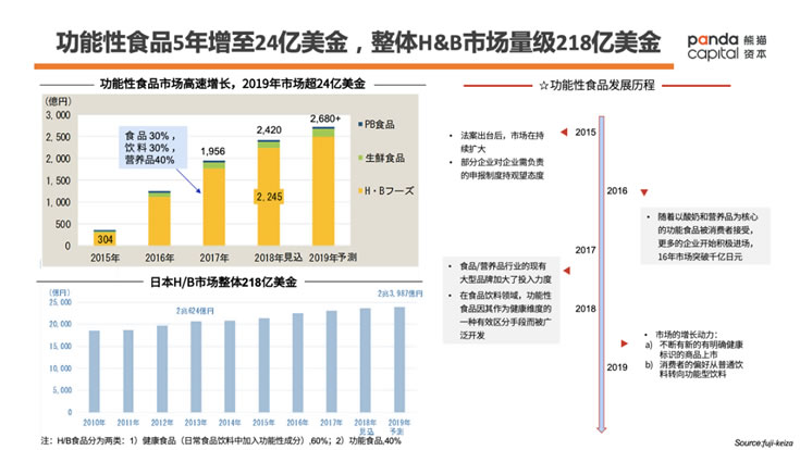從更大的維度來看,日本健康(Healthy)和美容(Beauty)市場(簡稱H/B市場)整體是218億美金的規(guī)模。H/B食品分為兩類,一類為健康食品,比如在日常食品飲料中加入功能性的成分,占到60%左右;另一類是功能食品,比如維生素片等,占到40%左右。