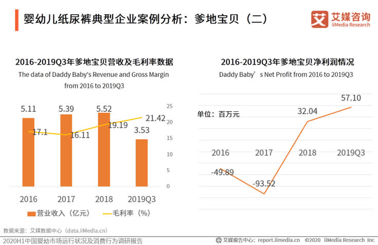 數(shù)據(jù)顯示,爹地寶貝營收2016-2018年間保持持續(xù)增長,到2019年的第三季度營收額達到3.53億元,在2018年達到了凈利潤扭虧為盈的狀態(tài)。艾媒咨詢分析師認為,國內(nèi)嬰幼兒市場發(fā)展的巨大潛力,給爹地寶貝等原本就具有一定影響力的嬰幼兒品牌帶來了持續(xù)性的發(fā)展?jié)撃堋?/p>