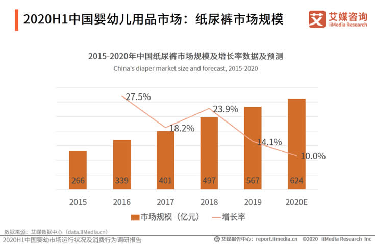 iiMedia Research (艾媒咨詢)數(shù)據(jù)顯示,2015-2019年期間,中國嬰幼兒紙尿褲市場規(guī)模不斷擴大,2016年達到27.5%的高增長率,此后持續(xù)增長。2019年市場規(guī)模達到567億元,預測2020年將上升至624億元。艾媒咨詢分析師認為,隨著用戶消費水平的提高以及消費能力意識的增強,中國嬰兒的紙尿褲使用比例不斷提升,特別在二孩政策的推動下,中國紙尿褲市場規(guī)模也不斷擴大。