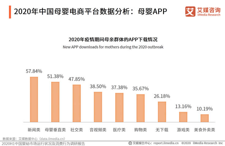 iiMedia Research(艾媒咨詢)數(shù)據(jù)顯示,疫情期間母親群體新下載最多的APP類型排名前三的是新聞類、母嬰垂直類、社交類。其中選擇下載母嬰垂直類APP的占比達到51.38%。艾媒咨詢分析師認為,疫情出門受限期間,手機App成為了豐富用戶業(yè)余生活的重要工具,母嬰垂直類平臺獲得發(fā)展機遇,迎來上升期。