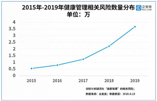 行業(yè)風(fēng)險方面,企查查顯示,健康管理相關(guān)的風(fēng)險數(shù)量在近年來直線上升,2015年,健康管理相關(guān)的風(fēng)險數(shù)量為0.54萬條,而到了2019年,該數(shù)據(jù)已達(dá)到3.67萬。