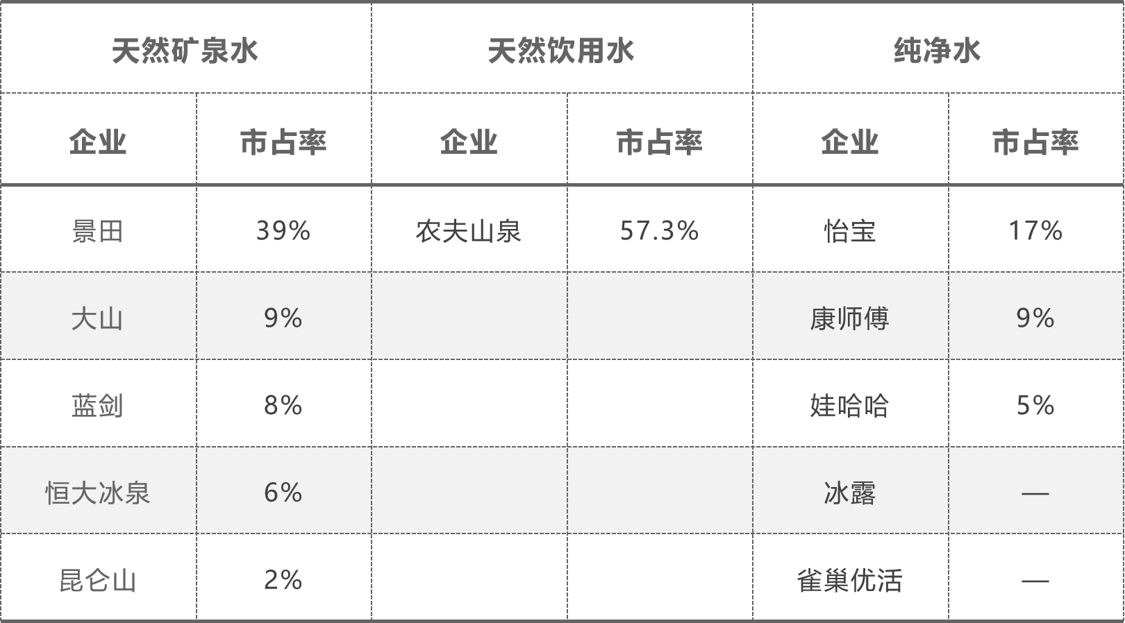 根據(jù)歐睿數(shù)據(jù),2019年國(guó)內(nèi)軟飲行業(yè)規(guī)模5786億元,其中瓶裝水為1999億元,占比為34.6%,穩(wěn)居第一大品類(lèi),較2009年提升13.5%,且未來(lái)有望延續(xù)高增趨勢(shì)。其中天然礦泉水市場(chǎng)規(guī)模約為629億元,天然飲用水330億元,純凈水924億元,各品類(lèi)龍頭企業(yè)及市占率如下: