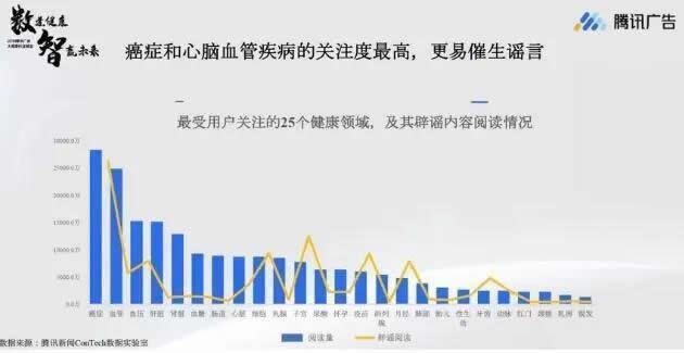 根據(jù)報(bào)告,在25個(gè)用戶最關(guān)注的健康領(lǐng)域中,用戶對(duì)重大疾病以及女性健康相關(guān)信息的真假極為關(guān)注。用戶對(duì)癌癥和心腦血管疾病的關(guān)注度最高,兩類疾病的高發(fā)病率、高死亡率催生了公眾的恐懼心理,預(yù)防癌癥是當(dāng)今公眾最關(guān)注的健康話題。值得注意的是,這兩個(gè)領(lǐng)域也是謠言頻發(fā)之地,辟謠閱讀極高,例如血管疾病的辟謠閱讀甚至超過(guò)了其話題閱讀量,超過(guò)2.5億。從用戶最關(guān)注的病癥來(lái)看,更體現(xiàn)出人們對(duì)于高死亡率疾病的重視程度。