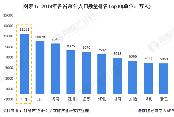 根據(jù)各省市的發(fā)展統(tǒng)計公報數(shù)據(jù),2019年廣東省常住人口數(shù)量排名全面第一,達(dá)到11521萬人,比第二名高出1451萬人,是名副其實的人口大省。人口數(shù)量與市場產(chǎn)品需求呈現(xiàn)正相關(guān)關(guān)系。