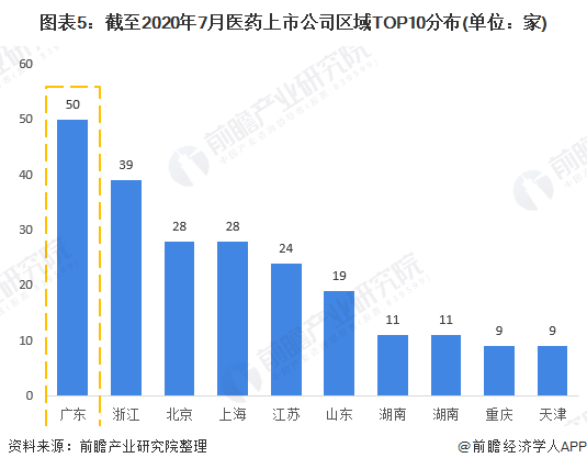 根據(jù)中信證券行業(yè)分類(2020)查詢,截至2020年7月27日,共有醫(yī)藥行業(yè)上市公司323家,其中廣東省領(lǐng)跑全國,有用50家醫(yī)藥業(yè)上市公司;其次是浙江省的39家;北京和上海不分上下,各擁有28家醫(yī)藥上市公司。
