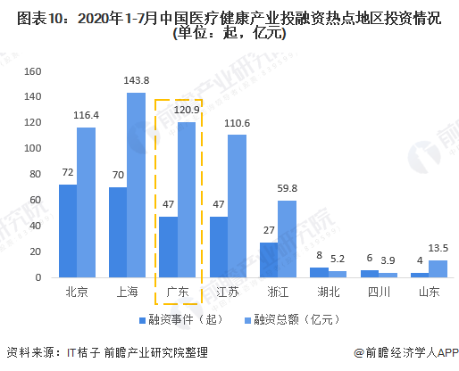 從整體來看,2020年1-7月廣東省在醫(yī)療健康領(lǐng)域融資金額排名第二,融資數(shù)量排名第三,醫(yī)療健康投資市場較為活躍。