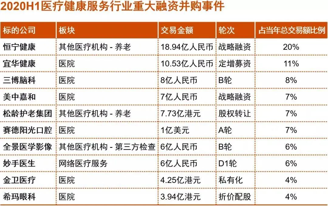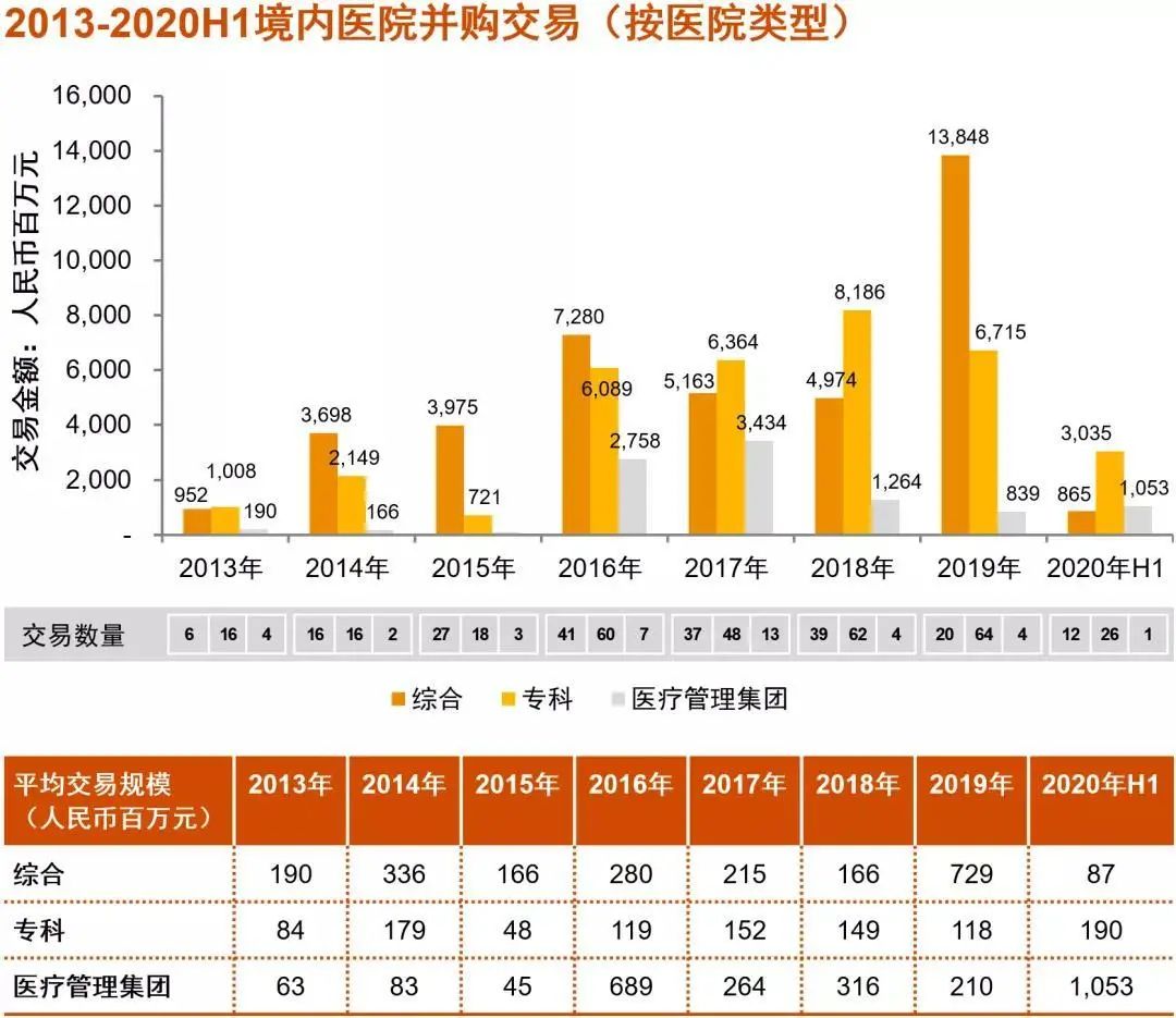 醫(yī)院板塊仍是最大熱點(diǎn)。相較于以往以企業(yè)醫(yī)院改制進(jìn)程為主的并購趨勢,以腦科、IVF、腫瘤為代表的專科醫(yī)院成為2020年上半年主要并購趨勢。
