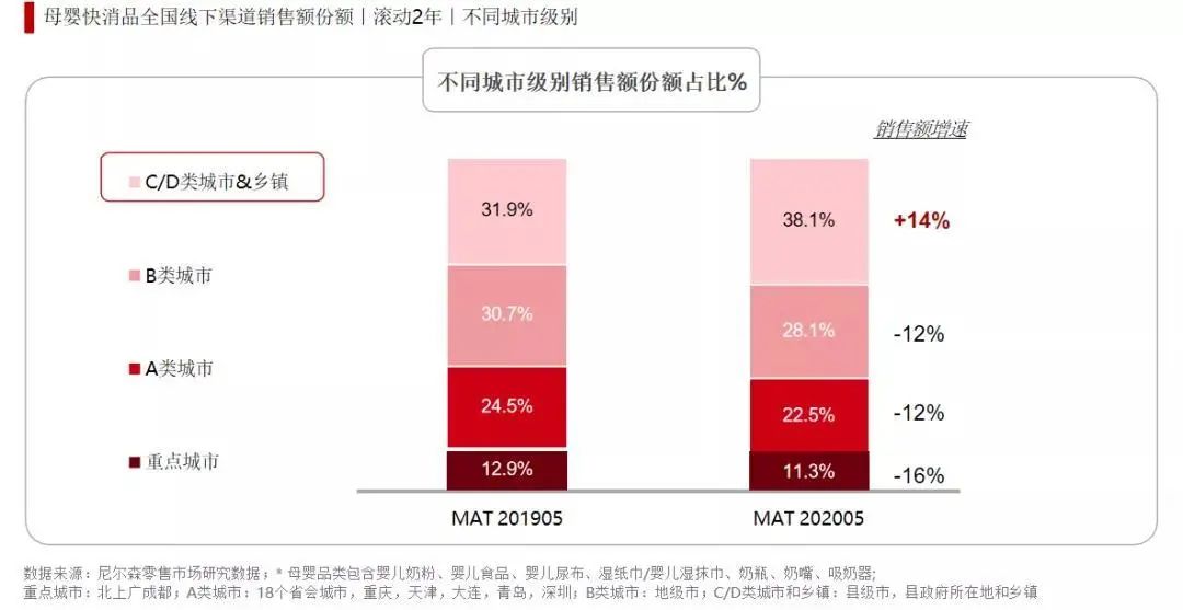 在近兩年,全渠道布局一直都是趨勢(shì),但在2020年之前,很多奶粉品牌雖然也開始重視線上渠道,但還是堅(jiān)持走線下銷售的路線,尤其是國產(chǎn)品牌,把發(fā)力重心還是放在線下母嬰店,其中將求增量空間的目光轉(zhuǎn)向下沉市場(chǎng),當(dāng)然當(dāng)下下沉市場(chǎng)的增速仍為顯著,還有較大的發(fā)展空間,《報(bào)告》指出,截至2020年5月,整個(gè)母嬰快消品類在低線城市及鄉(xiāng)鎮(zhèn)的銷售額占比為38.1%,同比增長(zhǎng)14%,而其他上線城市的增速均在下滑,尤其是北上廣、成都等重點(diǎn)城市,下滑最為嚴(yán)重。