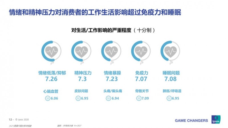 亞健康是指人體處于健康和疾病之間的一種狀態(tài),處于亞健康狀態(tài)者,主要表現(xiàn)為一定時(shí)間內(nèi)活力降低、功能和適應(yīng)能力減退等癥狀。在接受調(diào)研的近3000名被訪者中,對精神壓力大、五官健康和頭皮頭發(fā)問題的關(guān)注度有所上升(對比2019年中國成人健康管理白皮書)。情緒低落(7.26)和精神壓力(7.3)對消費(fèi)者的工作和生活的影響超過免疫力(7.07)和睡眠(7.09)問題。
