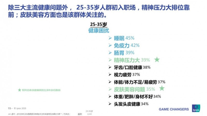 各年齡層對健康的關(guān)注點(diǎn)不同,年輕群體(18-24歲)在視力和口腔的健康關(guān)注較高,情緒和肥胖問題備受該群體關(guān)注。25-35歲的人,他們初入職場,容易出現(xiàn)焦慮,除了三大主流健康問題外,精神壓力大(39%)和皮膚美容(35%)也是該群體重點(diǎn)關(guān)注的方向。