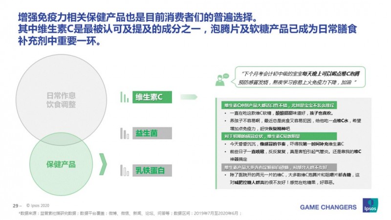 維生素C對身體的益處多多,不僅可以提高身體免疫力還有抗衰老等豐富功效。益普索社媒研究數(shù)據(jù)顯示,維生素C是最被消費(fèi)者認(rèn)可和經(jīng)常提及的成分之一,富含維生素C的泡騰片及軟糖產(chǎn)品,已成為日常膳食補(bǔ)充劑中的重要一環(huán)。