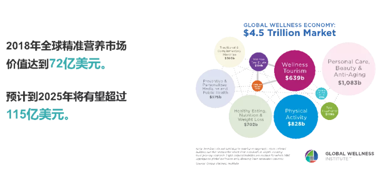 作為可以有效促進(jìn)人體健康、預(yù)防疾病的重要干預(yù)手段,“精準(zhǔn)營(yíng)養(yǎng)”對(duì)提高國(guó)民的整體營(yíng)養(yǎng)健康水平和生命質(zhì)量發(fā)揮積極作用,擁有巨大的發(fā)展空間。根據(jù)最新的市場(chǎng)研究報(bào)告顯示,2018年全球精準(zhǔn)營(yíng)養(yǎng)市場(chǎng)價(jià)值約為72億美元,預(yù)計(jì)到2025年將達(dá)到115億美元,2020至2025年的年復(fù)合增長(zhǎng)率為7.03%。