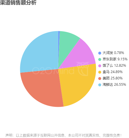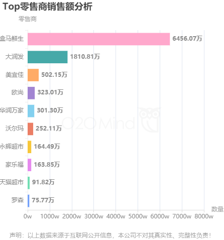 據(jù)O2OMind 2021年3月數(shù)據(jù)顯示,TOP10 零售商中,有5家大賣場,3家超市和兩家便利店;銷量前三的零售商家為盒馬鮮生、大潤發(fā)、美宜佳。