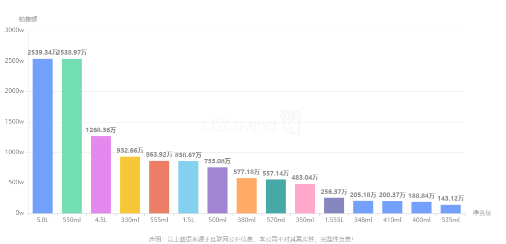 而在O2O市場,中大規(guī)格包裝飲用水表現(xiàn)同樣不俗。據(jù)O2OMind數(shù)據(jù)顯示,2021年3月包裝飲用水各大O2O平臺銷售額前三為5.0L、550mL、4.0L等中大規(guī)格包裝飲用水。