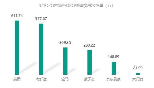 據(jù)O2OMind 數(shù)據(jù)顯示,2021年3月O2O市場中,美團包裝飲用水銷量高達611.74萬,居首位;其次是淘鮮達和盒馬,銷量約577.67萬、309.35萬。