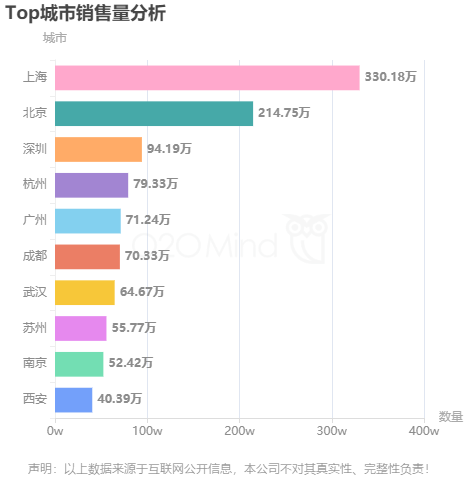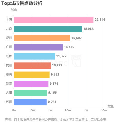 包裝飲用水在O2O售點數(shù)較多的一線、新一線城市銷量較高。據(jù)O2OMind 2021年3月數(shù)據(jù)顯示,上海擁有兩萬多個O2O售點,該城市O2O市場包裝飲用水銷量最高,達330.18萬,北京214.75萬次之。