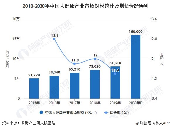 2010-2030年中國大健康產(chǎn)業(yè)市場規(guī)模統(tǒng)計及增長情況預測