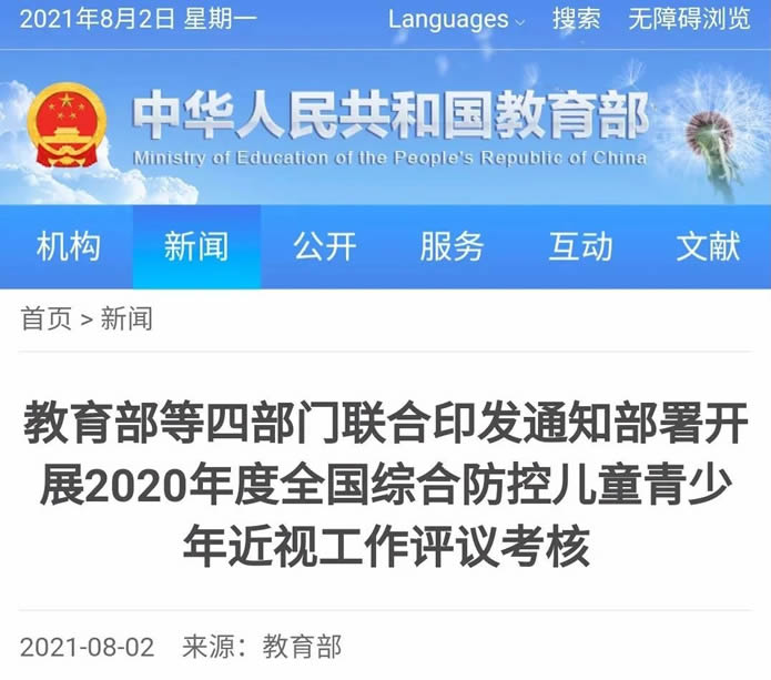 為深入貫徹落實(shí)習(xí)近平總書記關(guān)于兒童青少年近視防控系列重要指示批示精神,落實(shí)經(jīng)國(guó)務(wù)院同意的《綜合防控兒童青少年近視實(shí)施方案》和《全國(guó)綜合防控兒童青少年近視工作評(píng)議考核辦法(試行)》部署要求。近日,教育部、國(guó)家衛(wèi)生健康委、國(guó)家體育總局、市場(chǎng)監(jiān)管總局聯(lián)合印發(fā)《關(guān)于開展2020年度全國(guó)綜合防控兒童青少年近視工作評(píng)議考核的通知》,面向各省級(jí)人民政府部署開展2020年度全國(guó)綜合防控兒童青少年近視工作評(píng)議考核。