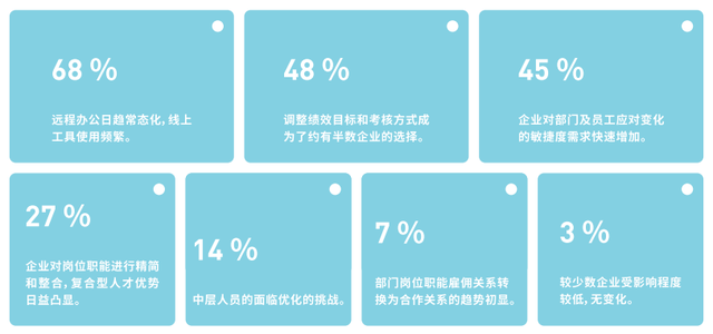 同時企業(yè)的敏捷性也大幅提高,比如在疫情下快速調(diào)整部門及崗位職能需求、調(diào)整績效目標(biāo)及考核方式以及整合內(nèi)外部門職能等多項政策以適應(yīng)環(huán)境挑戰(zhàn)和發(fā)展需求。