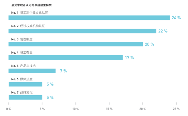 數(shù)千名求職者最認(rèn)可的優(yōu)秀雇主特質(zhì)的調(diào)研結(jié)果顯示,24%的求職者更看重對企業(yè)文化的認(rèn)同,22%的求職者選擇了權(quán)威認(rèn)證雇主品牌,雇主品牌正逐步和企業(yè)文化一起成為人才選擇的最重要因素。