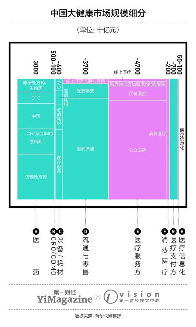 在狹義的健康市場外,與消費者更為貼近的是以保健品(保健食品、營養(yǎng)補充劑等)、保健器械(家用醫(yī)療器械,比如血壓計、血糖儀等)、消費醫(yī)療服務(口腔、疫苗、醫(yī)美等)等更為泛化概念的大健康消費市場。