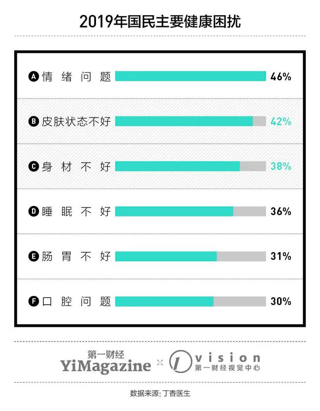 丁香醫(yī)生的數(shù)據(jù)顯示,在2019年,困擾國民的健康問題主要是情緒問題、皮膚狀態(tài)不好、身材不好等因素。其中,超過50%的00后和95后受訪者認為自己受到“皮膚狀態(tài)不好”的困擾,超過40%的同一群體認為自己有“身材不好”的困擾。