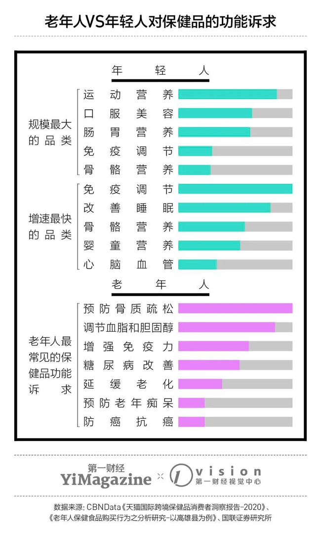 在過去,“養(yǎng)生”是老年人的專屬。老年人常見的對健康類產(chǎn)品的訴求是預防骨質(zhì)疏松、調(diào)節(jié)血脂與膽固醇、增強免疫力、調(diào)理慢性病等。現(xiàn)在,健康消費類產(chǎn)品正從過去以老年人為主向全年齡段發(fā)展。根據(jù)第一財經(jīng)商業(yè)數(shù)據(jù)中心的分析,免疫調(diào)節(jié)、改善睡眠和骨骼健康的產(chǎn)品增速最高,腸胃營養(yǎng)、口服美容和運動營養(yǎng)等產(chǎn)品主要由年輕人消費。